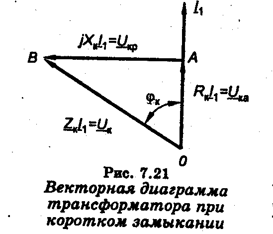 Зная сопротивления Zk, Rk и Хктрансформатора, можно построить треугольник напряжений короткого замыкания (треугольник ОАВ на рис. 7.21), а также определить активную и индуктивную составляющие напряжения короткого замыкания: Uка=Uкcosφк; Uкр=Uкsinφк.