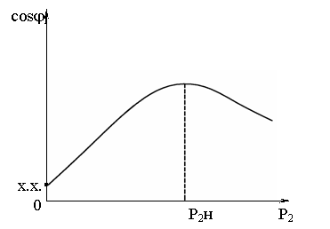 Снижение cosφхх объясняется тем, что активная мощность мала (P1хх = ∆Pэл + ∆Pст + ∆Pмех), а реактивная мощность Q1 остается такой же, как и в номинальном режиме. На рис. 2.28 показана зависимость коэффициента мощности асинхронного двигателя от нагрузки на валу. При большой недогрузке асинхронного двигателя он имеет низкий коэффициент мощности, что экономически невыгодно.