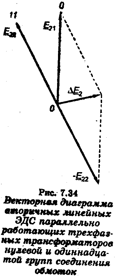Таким образом, трансформаторы с разными Uк загружаются по-разному: трансформатор с меньшим ик загружается большим током, чем трансформатор с большим Uк. При увеличении мощности приемников увеличивается нагрузка на оба трансформатора. Однако когда нагрузка трансформатора Т1 достигнет номинального значения, нагрузка трансформатора Т2 будет еще далека от номинальной. Полностью мощность трансформатора Т2 не может быть использована, так как трансформатор Т1 окажется перегруженным. Поэтому включаемые на параллельную работу трансформаторы должны иметь равные значения Uк. Допускается отклонение от среднеарифметического значения не более чем на ±10%.Третье условие является абсолютно жестким. Если трансформаторы принадлежат к разным группам соединения обмоток, то между векторами линейных вторичных ЭДС (следовательно, и напряжений) сдвиг фаз будет отличаться от 0°, а их векторная разность не будет равна нулю. На рис. 7.34 показана векторная диаграмма линейных вторичных ЭДС трансформаторов, принадлежащих к нулевой и одиннадцатой группам соединения обмоток. Возникающая ЭДС ΔE2=E21 – E22настолько велика, что создаваемый ею уравнительный ток превышает номинальный ток в несколько раз и режим оказывается аварийным.
