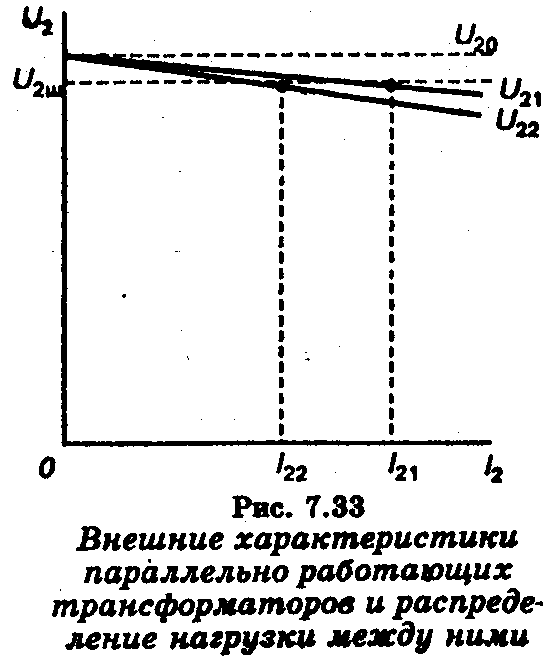 Так как вторичные обмотки обоих трансформаторов подключают к общим шинам, то напряжения на их вторичных обмотках будут всегда одинаковы и равны напряжению на шинах U2ш. При некоторой нагрузке напряжение U2шбудет иметь значение, соответствующее штриховой линии на рис. 7.33, точки пересечения которой с внешними характеристиками трансформаторов являются рабочими точками для данного режима. Абсциссы этих точек определяют ток нагрузки каждого трансформатора, причем I22 < I21.