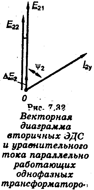 Так как первичные обмотки трансформаторов подключены к одному источнику с напряжением U1, то при холостом ходе для равенства вторичных напряжений всех трансформаторов необходимо, чтобы были равны их вторичные ЭДС. Это имеет место только при равенстве коэффициентов трансформации. Если у трансформатора Т1 (рис. 7.31а) коэффициент трансформации больше, чем у трансформатора Т2, то E21 > Е22. В замкнутом контуре вторичных обмоток трансформаторов под действием ЭДС ΔЕ2 = E21- Е22 ≠ 0 возникнет уравнительный ток I2y, который будет трансформироваться в первичные обмотки. Значение этого тока зависит также от сопротивления обмоток трансформаторов, а фаза тока — от составляющих полных сопротивлений трансформаторов (рис. 7.32). Уравнительный ток в обмотках не является током нагрузки, он нагревает обмотки и снижает полезную мощность трансформатора. Считается допустимым для практики отклонение значения коэффициентов трансформации друг от друга на 0,5%.