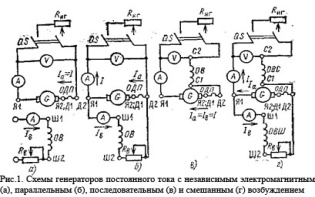 У генераторов смешанного возбуждения (рис. 1, г) на полюсах размещаются две обмотки. Одна из них, имеющая большое число витков и выполненная из проводников относительно небольшого сечения, включается параллельно с якорем, а другая обмотка с малым числом витков из проводников большого сечения включается последовательно с якорем. Ток якоря такого генератора равен Ia = I + Iв.