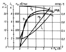 Рабочие характеристики асинхронного двигателя представляют собой зависимости скольжения S, числа оборотов ротора n2, развиваемого момента М, потребляемого тока I1, расходуемой мощности Р1, коэффициента мощности соs j и к. п. д. η от полезной мощности Р2 на валу машины. Эти характеристики снимаются три естественных условиях работы двигателя, т. е. двигатель нерегулируемый, частота f1 и напряжение U1 сети остаются постоянными, а изменяется только нагрузка на валу двигателя.