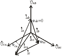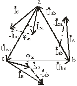 Векторная диаграмма для случая, когда в фазе ab имеется активная нагрузка, в фазе bc – активно-индуктивная, а в фазе ca – активно-емкостная приведена на рис. 3.16, топографическая диаграмма – на рис. 3.17.