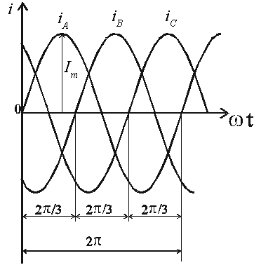 Сумма мгновенных значений токов равна нулю – доказывается с помощью временных диаграмм трехфазной системы токов (см. рис.)