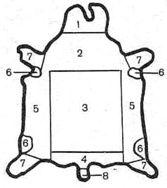 В зависимости от вида, массы или площади шкуры подразделяют на 4 группы. Внутри каждой группы в зависимости от количества пороков, места их расположения шкуры подразделяют на 4 сорта. Пороки определяют органолептически, а их размер - с помощью измерительных инструментов. Особое внимание обращается на наличие пороков на самой ценной части шкуры (чепраке или крупоне). При этом три порока на краю шкуры приравниваются к одному посередине. Краями шкуры считают вороток, полы, огузок (рис. 8); краями свиных крупонов участок на расстоянии 3 см по контуру шкуры. Количество пороков, допускаемых в каждом сорте, указано в таблице 7.