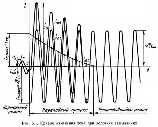 Известно, что в цепи; содержащей индуктивность, всякое изменение тока вызывает изменение магнитного потока, который наводит в этой цепи ЭДС самоиндукции. Под действием последней в цепи устанавливается апериодический ток обратного направления (рис. 6.1), который в начальный момент (t=0) равен разности мгновенных значений токов нагрузки рабочего режима iн0 и периодической составляющей тока КЗ.