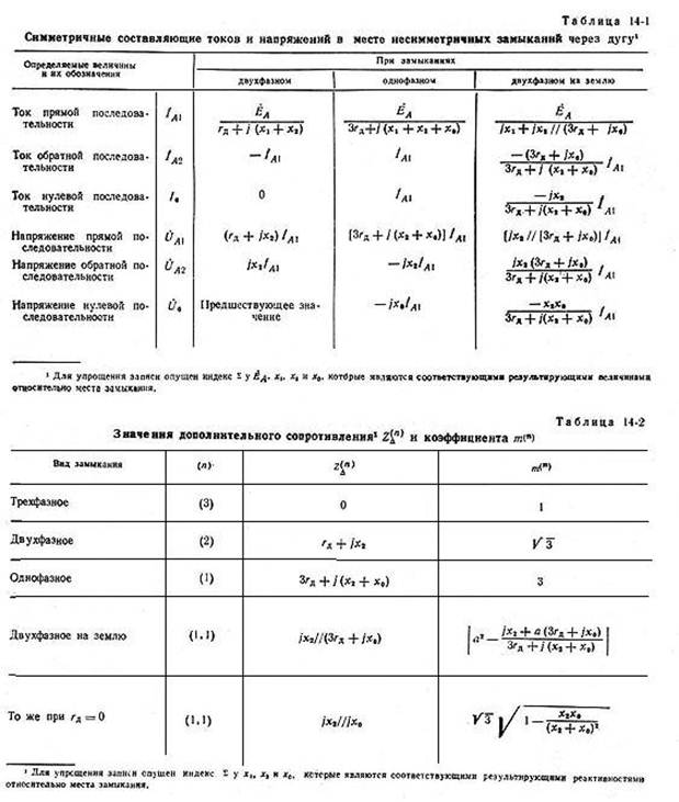 Обращаясь к полученным в предыдущих параграфах выражениям для симметричных составляющих токов и напряжений в месте несимметричного короткого замыкания, которые для большей наглядности сведены в табл. 14-1, замечаем, чта токи обратной и нулевой последовательностей и напряжения всех последовательностей пропорциональны току прямой последовательности в месте короткого замыкания.