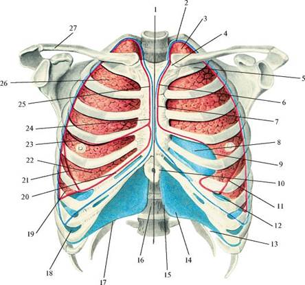 Границы плевры и легких. Вид спереди. 1 - передняя срединная линия, 2 - купол плевры, 3 - верхушка легкого, 4 - грудино-ключичный сустав, 5 - первое ребро, 6 - передняя граница левой плевры, 7 - передний край левого легкого, 8 - реберно-медиастинальный синус, 9 - сердечная вырезка, 10 - мечевидный отросток, 11 - косая щель левого легкого, 12 - нижний край левого легкого, 13 - нижняя граница плевры, 14 - диафрагмальная плевра, 15 - задний край плевры, 16 - тело XII грудного позвонка, 17 - нижняя граница правого легкого, 18 - реберно-диафрагмальный синус, 19 - нижняя доля легкого, 20 - нижний край правого легкого, 21 - косая щель правого легкого, 22 - средняя доля правого легкого, 23 - горизонтальная щель правого легкого, 24 - передний край правого легкого, 25 - передний край правой плевры, 26 - верхняя доля правого легкого, 27 - ключица.