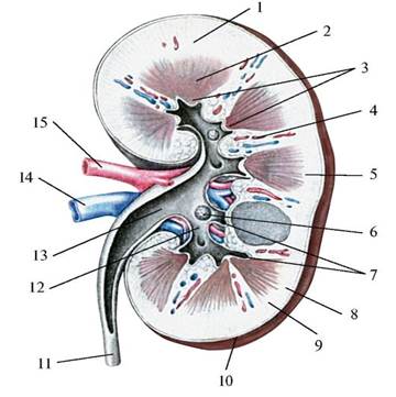 Строение почки. Фронтальный разрез. 1 - корковое вещество почки, 2 - мозговое вещество почки, 3 - почечные сосочки, 4 - почечный столб, 5 - основание почечной пирамиды, 6 - решетчатое поле, 7 - малые почечные чашки, 8 - лучистая часть, 9 - свернутая часть, 10 - фиброзная капсула, 11 - мочеточник, 12 - большая почечная чашка, 13 - почечная лоханка, 14 - почечная вена, 15 - почечная артерия.