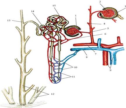 Схема строения нефрона. 1 - почечное тельце, 2 - клубочек почечного тельца (капилляры), 3 - капсула клубочка, 4 - междольковая артерия, 5 - приносящая клубочковая артериола, 6 - выносящая клубочковая артериола, 7 - дуговая артерия, 8 - дуговая вена, 9 - междольковые сосуды, 10 - петля нефрона, 11 - околоканальцевая капиллярная сеть, 12 - сосочковые протоки, 13 - собирательная почечная трубочка, 14 - дистальная часть канальца нефрона, 15 - проксимальная часть канальца нефрона.