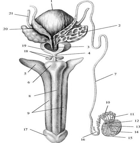 Мужские половые органы 1 - мочевой пузырь, 2 - семенные пузырьки (правый вскрыт), 3 - семявыбрасывающий проток, 4 - перепончатая часть мочеиспускательного канала, 5 - ножка полового члена, 6 - луковица полового члена, 7 - семявыносящий проток, 8 - губчатое тело полового члена, 9 - пещеристые тела полового члена, 10 - придаток яичка, 11 - выносящие канальцы яичка, 12 - сеть яичка, 13 - прямые семенные канальцы, 14 - извитые семенные канальцы, 15 - белочная оболочка яичка, 16 - нижние отклоняющие проточки, 17 - головка полового члена, 18 - бульбоуретральные железы, 19 - предстательная железа, 20 - ампула семявыводящего протока, 21 - мочеточник.
