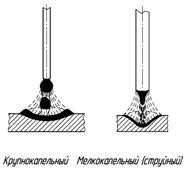 | Для сварки в защитных газах плавящимся электродом характерно высокий процент потерь электродного металла вследствие угара и разбрызгивания. Разбрызгиванию способствует вид переноса электродного металла, зависящий от параметров режима сварки (рисунок 2): крупнокапельный; смешанный; мелкокапельный. |
