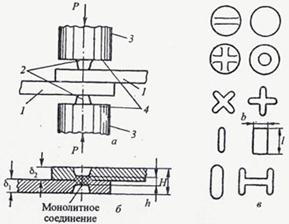 Схема холодной точечной сварки (а), геометрия сварного соединения (б) и формы пуансонов (в)
