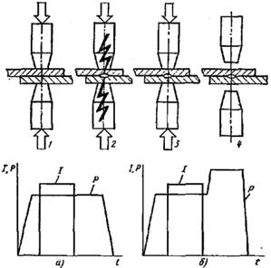 1 - сжатие деталей; 2 - включение тока; 3 - проковка; 4 - снятие давления с электродов
