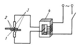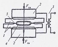 | Рисунок 1 – Схема точечной сварки: 1 – сварная точка, 2- свариваемые пластины, 3 – электроды, 4 – трансформатор. | Рисунок 2 - Схема точечной сварки: 1 - детали, 2 - электроды, 3 – источник энергии, 4 – зона расплавления металла, 5 – уплотняющий поясок. |