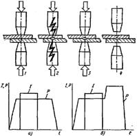 | Рисунок 3 - Стадии цикла и циклограммы точечной сварки а - без увеличения давления; б - с увеличением давления при проковке; 1 - сжатие деталей; 2 - включение тока; 3 - проковка; 4 - снятие давления с электродов |