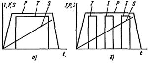 | а - непрерывное выключение тока; б - импульсное включение тока; I - сварочный ток; Р - давление; S - перемещение роликов; t - время. Рисунок 2 - Циклограммы шовной сварки |