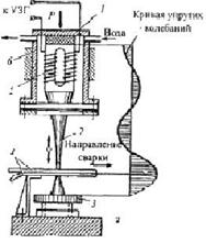 | Рисунок 1 - Схема ультразвуковой сварки: 1 - акустический узел; 2 - инструмент (волновод); 3 - регулировочный винт опоры; 4 - свариваемые детали; 5 - вибратор; 6 - кожух |