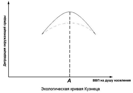 Довольно сложно точно определить точку перегиба в кривой Кузнеца — с какого уровня дохода на душу населения начинается улучшение экологической ситуации (точка А на рис. 1). Это зависит от многих факторов: