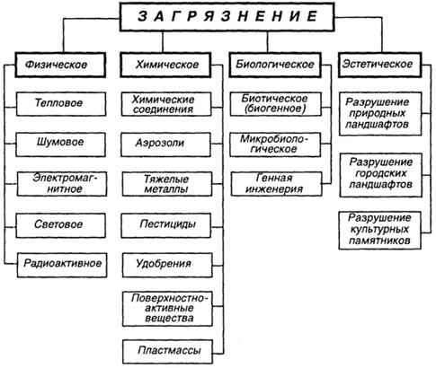 В настоящее время известно много видов загрязнения, вызванных различными загрязняющими веществами: загрязнение пестицидами, гербицидами, инсектицидами, канцерогенными углеводородами, нефтью и нефтепродуктами, радиоактивными веществами.