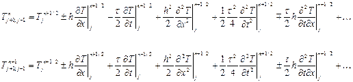2. Порядок аппроксимации. Найдем, с какой точностью разностное уравнение (2) аппроксимирует (1). Для этого разложим переменную Тjn (считая ее непрерывной Тjn = T(t,x)) в ряд Тейлора в некоторой точке. Из симметрии схемы удобно выбрать точку (tn+1/2, xj) тогда:
