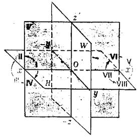 Для определения положения геометрического объекта в пространстве необходимо задаться какой-либо координатной системой отнесения. Наиболее удобной является система координат, состоящая из трех взаимно перпендикулярных плоскостей.