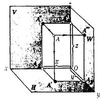 Эпюр точки А, представленный на рис.2.2., несет ту же информацию, что и пространственный макет. Горизонтальная проекция точки А определяется координатами х, у т.е. расстоянием от точки А до плоскостей W и V.