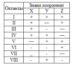 Положение точки в пространстве можно определить, если будут заданы хотя бы две ее координаты. Зная направление для положи-тельного и отрицательного значений координатных осей, определяется принадлеж-ность точки какому -либо из восьми октантов. Для этого можно составить следующую таблицу: