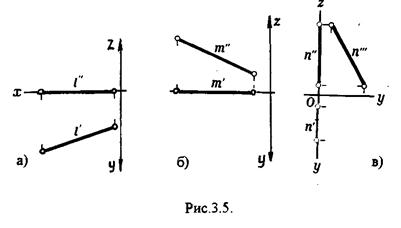 Характерным признаком таких прямых является принад-лежность двух проекций прямой координатным осям. На рис.3.5. показаны проекции прямых 1, т, п. Прямая 1 принадлежит горизонтальной плоскости проекции (рис.3.5.а.), прямая m –фрон-тальной плоскости проекции (рис.3.5.б.), прямая n -профильной плоскости проекции (рис. З.5.в.).