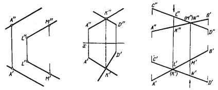 Если прямые в пространстве скрещиваются, то на чертеже их одноименные проекции могут и пересекаться, но точки пересечения этих проекций не лежат на одной линии связи (рис.З.б.в.).