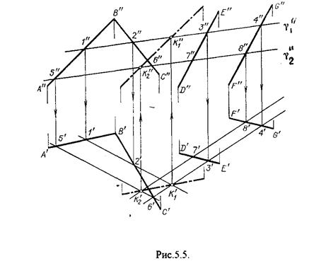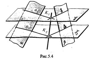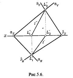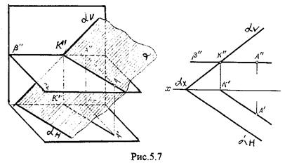 На рис.5.7. показан случай когда известно направление линии пересечения. Поэтому достаточно иметь лишь одну точку от пересечения следов и далее провести через эту точку прямую, исходя из положения плоскостей и их следов.