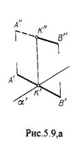 На рис.5.9а фронтальный след плоскости g является ее фронтальной проекцией. Проекция К² определяется в пересечении проекции А²В² и следа g². Аналогично решается задача на рис.5.9.б.