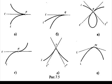 Точка кривой называется обыкновенной, если в этой точке к кривой можно провести единственную касательную. На рис.7.4. такой точкой является точка М.