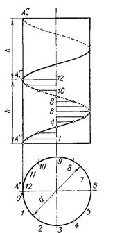 Для построения проекции винтовой линии предварительно строим проекции прямого кругового цилиндра (рис.7,11). Окружность основания цилиндра (горизонтальная проекция) и шаг (фронтальная проекция) делит на одинаковое число равных частей. Из точек деления окружности проводим линии связи, а через соответствующие точки деления шага горизонтальные прямые.