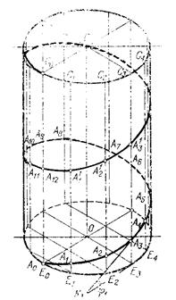 Цилиндрическая винтовая линия представляет собой траекторию точки, которая совершает равномерное поступательное движение вдоль оси равномерного вращающегося цилиндра. Ось цилиндра будет осью винтовой линии, а радиус его - радиусом винтовой линии. Расстояние Р., на которое точка перемещается вдоль оси цилиндра за один его оборот, называется шагом винтовой линии.