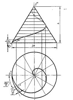 Если точка перемещается равномерно по обра-зующей прямого кругового конуса, а образующая совершает вращательное движение вокруг оси конуса с постоянной скоростью, то траекторией точки является коническая винтовая линия.
