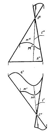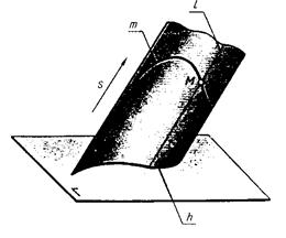 На комплексном чертеже коническая и цилиндрическая поверхности могут быть заданы проекциями направляющей m и вершины S в случае конической поверхности (рис.8.7.) или проекциями направляющей m и направления s образующей в случае цилиндрической поверхности (рис.8.10). Обычно при задании конической или цилиндрической поверхности в качестве направляющей выбирается, какая - нибудь линия уровня, например горизонталь h.