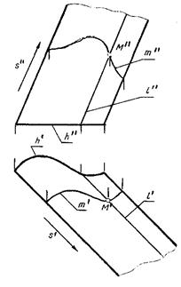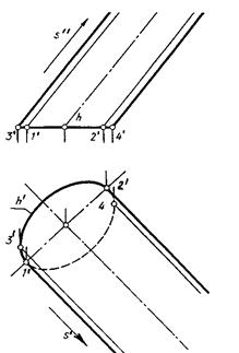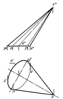 При этом горизонтальные проекции точек 1 и 2 являются точками касания к проекции hi направляющей h очерковых образующих, а проекции 3 и 4 являются точками касания к h1 линий связи. Этими очерковыми образующими определяются на плоскостях проекций области, внутри которых могут находиться проекции точек данных поверхностей, а также производится разграничение проекций поверхностей на видимую и невидимую части на каждой из плоскостей проекций.