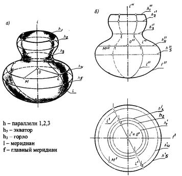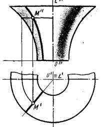 На плоскость Н в этом случае проецируются все параллели, а на плоскость V - два меридиана, которые определяют фронтальный очерк. Меридиан, расположенный в плоскости, параллельной V называют главным. Для того чтобы найти горизонтальную проекцию произвольной точки М, принадлежащей поверхности вращения, проводят через М² фронтальную проекцию параллели. Затем, простроив проекцию этой параллели на плоскости Н, определяют М¢.
