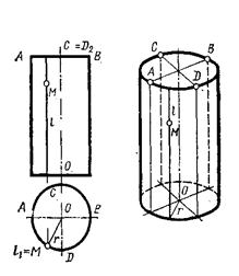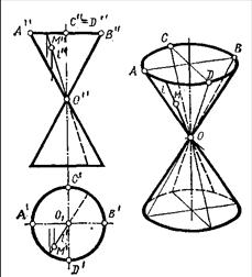 При вращении вокруг оси прямой линии образуется цилиндрическая поверхность вращения (образующая параллельна оси вращения) и коническая поверхность вращения (образующая пересекает ось вращения) (рис. 8.18., 8.19.)