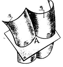 Пусть надо построить линию пересечения двух поверхностей Ф1 и Ф2. Выбирается третья поверхность Ф. Затем находится линия пересечения поверхностей Ф и Ф1, Ф и Ф2. Вид и расположение поверхности Ф относительно данных поверхностей должны быть выбраны так, чтобы в пересечении получились простые по форме линии (прямая или окружность), чтобы проекции этих линий было легко построить. Последовательность действий можно представить алгоритмом: