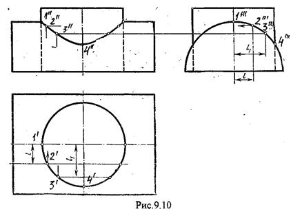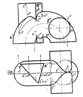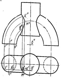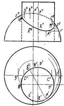 При таком расположении цилиндров горизонтальная проекция линии пересечения совпадает с окружностью - горизонтальной проекции цилиндра с вертикальной осью, а профильная проекция линии пересечения совпадает с полуокружностью профильной проекцией полуцилиндра с горизонтальной осью. Это выполняется потому что вертикальный цилиндр занимает горизонтально - проецирующее положение, а полуцилиндр - профильно проецирующее положение. Построение фронтальной проекции линии пересечения осуществляется по правилам построения третьей проекции точки, если известны две ее другие проекции.