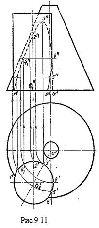 Используя эту принад-лежность, находим фронтальные проекции точек 1²6². Точка 3 так же является характерной, так как она принадлежит плоскости a, проходящей через оси вращения данных поверхностей. В этой плоскости находятся самая вы-сокая и самая низкая точка линии пересечения. Точка 3 находится на окружности, принадлежащей конусу. Эта окружность на горизонтальную плоскость проекции проецируется в натуральную величину а на фрон-тальную плоскость - в отрезок. Выбрав горизонтальную проек-цию 3¢, проводим окружность, находим фронтальную проекцию этой окружности, на ней находим точку 3². (Нахождение фрон-тальной проекции окружности видно из рис.9.11.). Точка 2 - самая дальняя, 4 - самая правая, 5 - самая близкая. Построив харак-терные точки, проекцию линии пересечения построить еще сложно, можно выбрать промежуточные (например: 41), и осуществить точно такие построения.