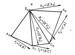 Определение дейст-вительной длины ребер пирамиды выполнено с помощью вращения их вокруг оси i (iÉS и i ^ H). Путем вращения реб-ра пирамиды совме-щаются с плоскостью b (плоскость b||V и bÉi). После того, как будут определены действительные вели-чины ребер [S¢¢A2], [S¢¢B2], [S¢¢C2], прис-тупают к построению развертки. Дня этого из произвольной точ-ки So проводят произ-вольную прямую а. Откладывают на ней от точки S0 [SoAo]@[S¢¢A2]. Из точ-ки ао проводят дугу радиусом r1= |А¢В¢½, а из точки So - радиусом ri =½S¢¢B2½. Пересе-чение дуг укажет по-ложение вершины Во треугольника S0A0B0 (треугольник SoAoBo = треугольник SAB - грани пирамиды). Аналогично находятся точки So и ао. Соединив точки AoBoCoA0So, получим развертку поверхности пирамиды SABC.