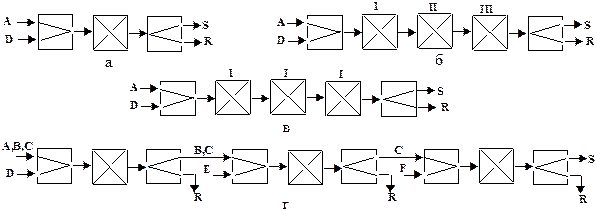 Рис. 7. Схемы последовательных ТС для процессов: с высокой степенью превращения в одном элементе; б –многостадийного; в- с использованием каскада реакторов; г-с постадийной переработкой многокомпонентного сырья А, В, С- компоненты сырья; D,E,F - реагенты; R,S- целевые и побочные продукты.