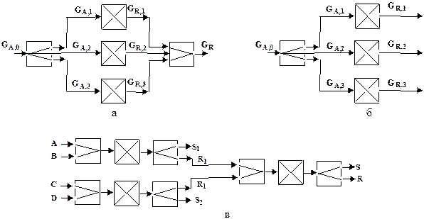 а) для увеличения производительности производства, т.е. если производительность одного элемента значительно меньше, чем производительность всей ХТС (рис. 9,а). В этой ТС производительность всех элементов, которые работают параллельно, одинакова как по сырью (GA1=GA2=GA3),так и по целевому продукту (GR1=GR2=GR3), а общая производительность системы равняется сумме продуктивностей отдельных элементов (GR= GR1+GR2+GR3). В этом случае каждый из параллельных потоков и элементы, которые он проходит, называют технологической нитью. Перечень элементов в технологических нитях, их размеры, конструкции и технические характеристики являются одинаковыми. Это дает возможность легче организовать производство (приобрести однотипное оборудование); упростить реализацию технологического процесса, обслуживание и ремонт оборудования;