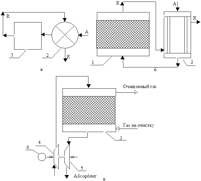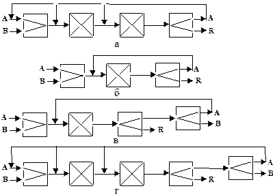Рис. 10. Схемы обратных ТС: а - общая схема, а также сопряженный рецикл; б – полный рецикл; в – фракционный рецикл; г – сложный рецикл.: А, В -реагенты; R- продукт