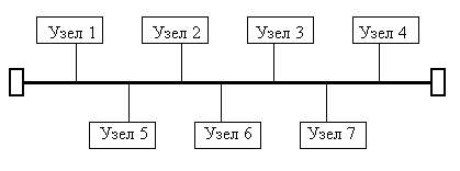 Данные от передающего узла сети распространяются по шине в обе стороны. Промежуточные узлы не транслируют поступающих сообщений. Информация поступает на все узлы, но принимает сообщение только тот, которому оно адресовано. Дисциплина обслуживания параллельная.