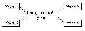 Звездообразная топология - базируется на концепции центрального узла, к которому подключаются периферийные узлы (рис.24). Каждый периферийный узел имеет свою отдельную линию связи с центральным узлом. Вся информация передается через центральный узел, который ретранслирует, переключает и маршрутизирует информационные потоки в сети.